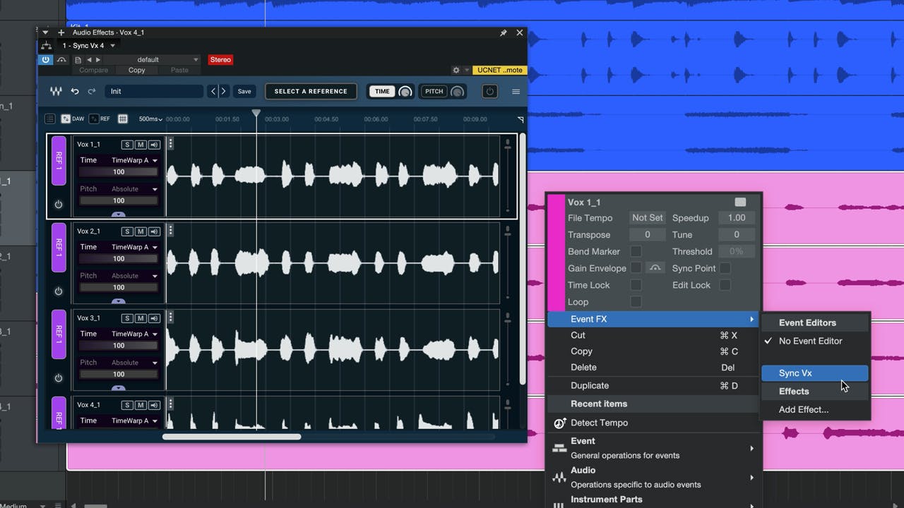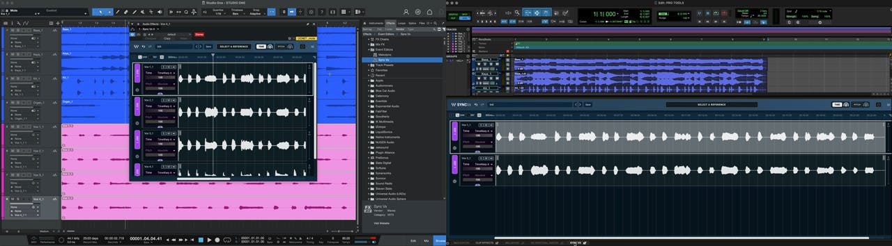 Sync Vxの場合、この機能によって、複数のボーカルテイクやコンピングされた録音が異なるトラックに分散していても、それらをシームレスに編集・同期させることができます。