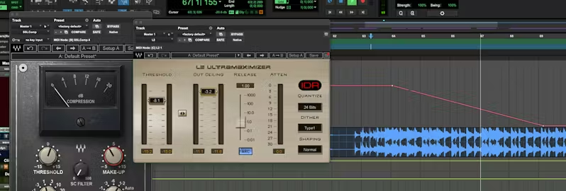 この場合、正しいフェードアウトの方法は、マスタリングチェーンの「中」でボリュームを下げることです。最終リミッターの後段に、シンプルなGainやTrimプラグインを挿し、そのプラグインのレベルをオートメーションします。そうすることで、ダイナミクスのキャラクターは保たれ、リミッターも最後の瞬間まで正しく動作します。